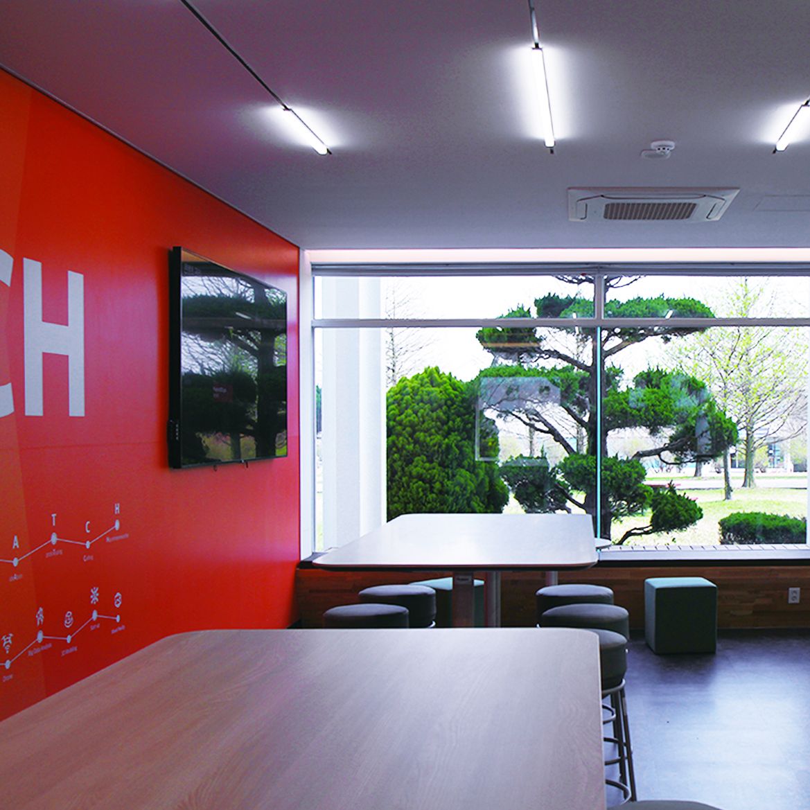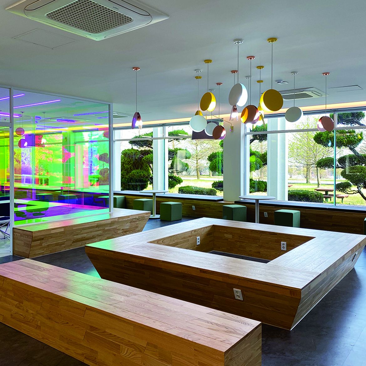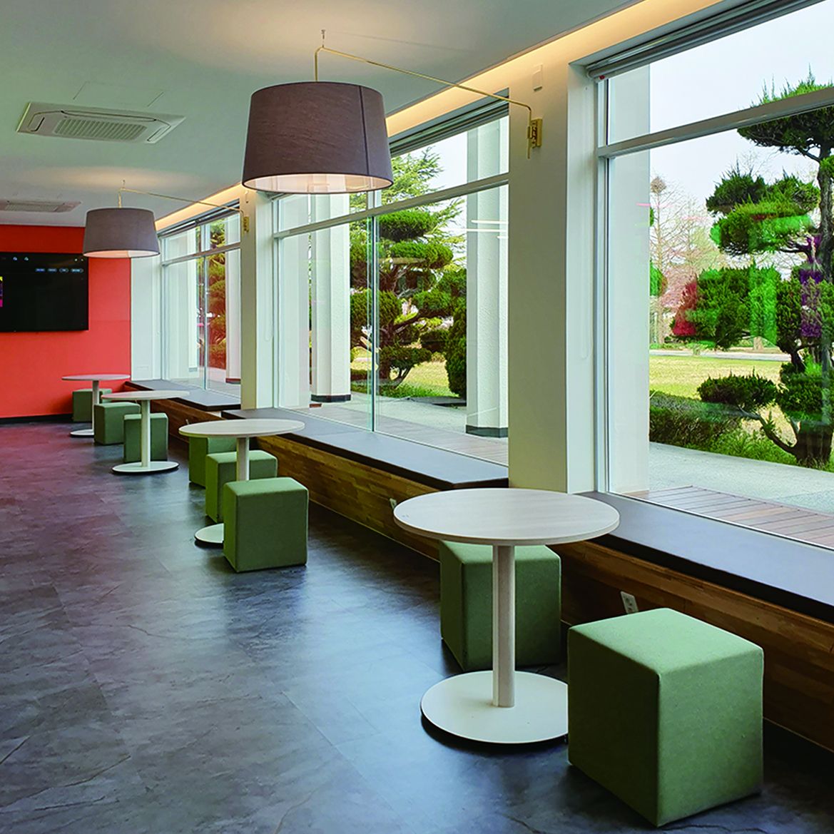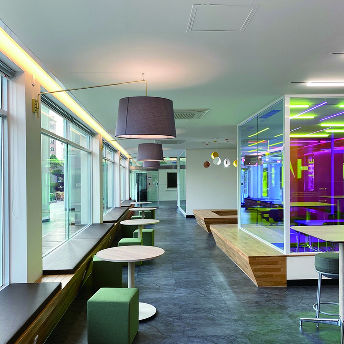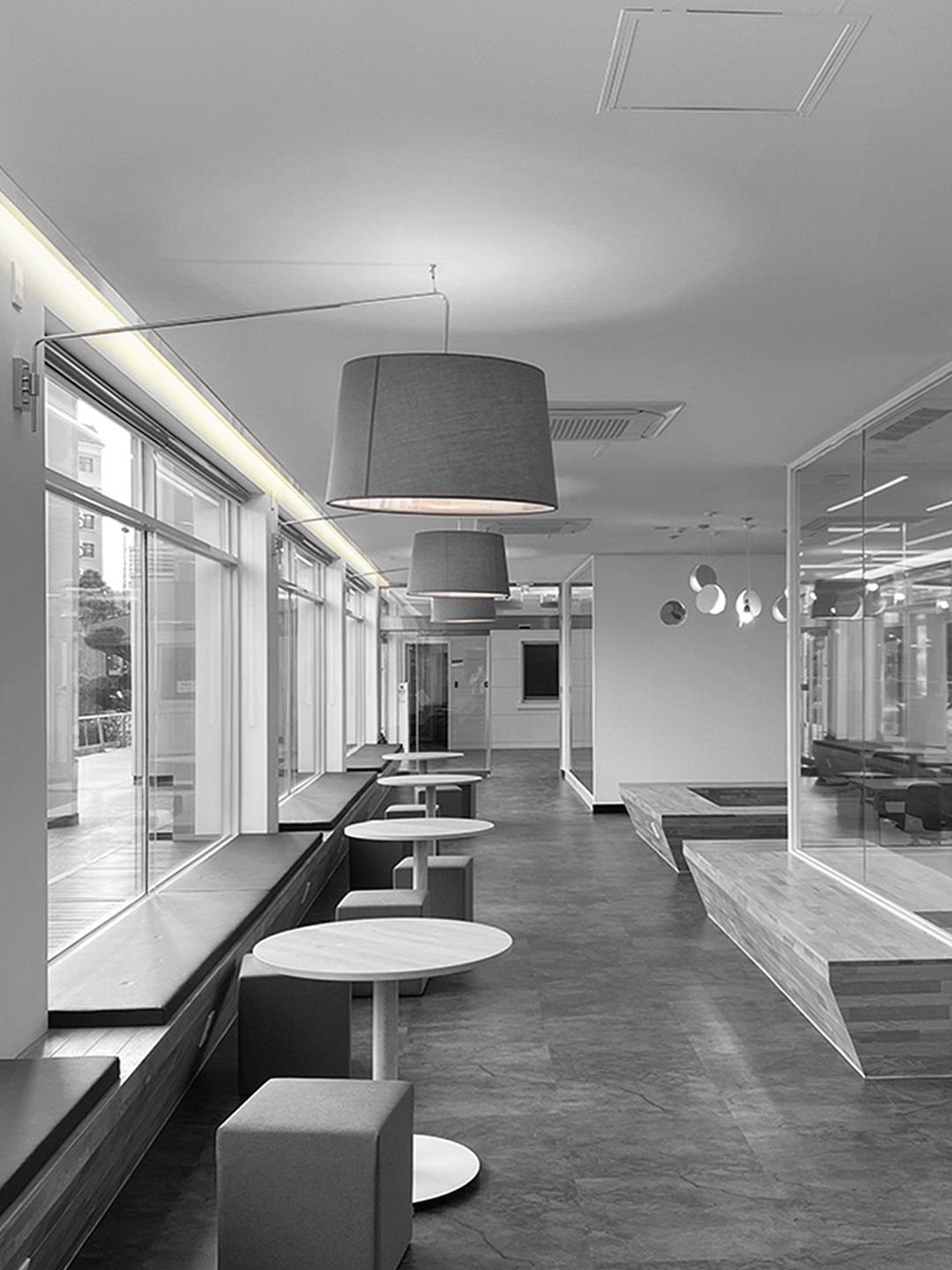 Student lounge design inside the College of Business at Jeonju University. The flexible space supports both team projects and individual study for business students, allowing natural transitions between collaboration and focus.