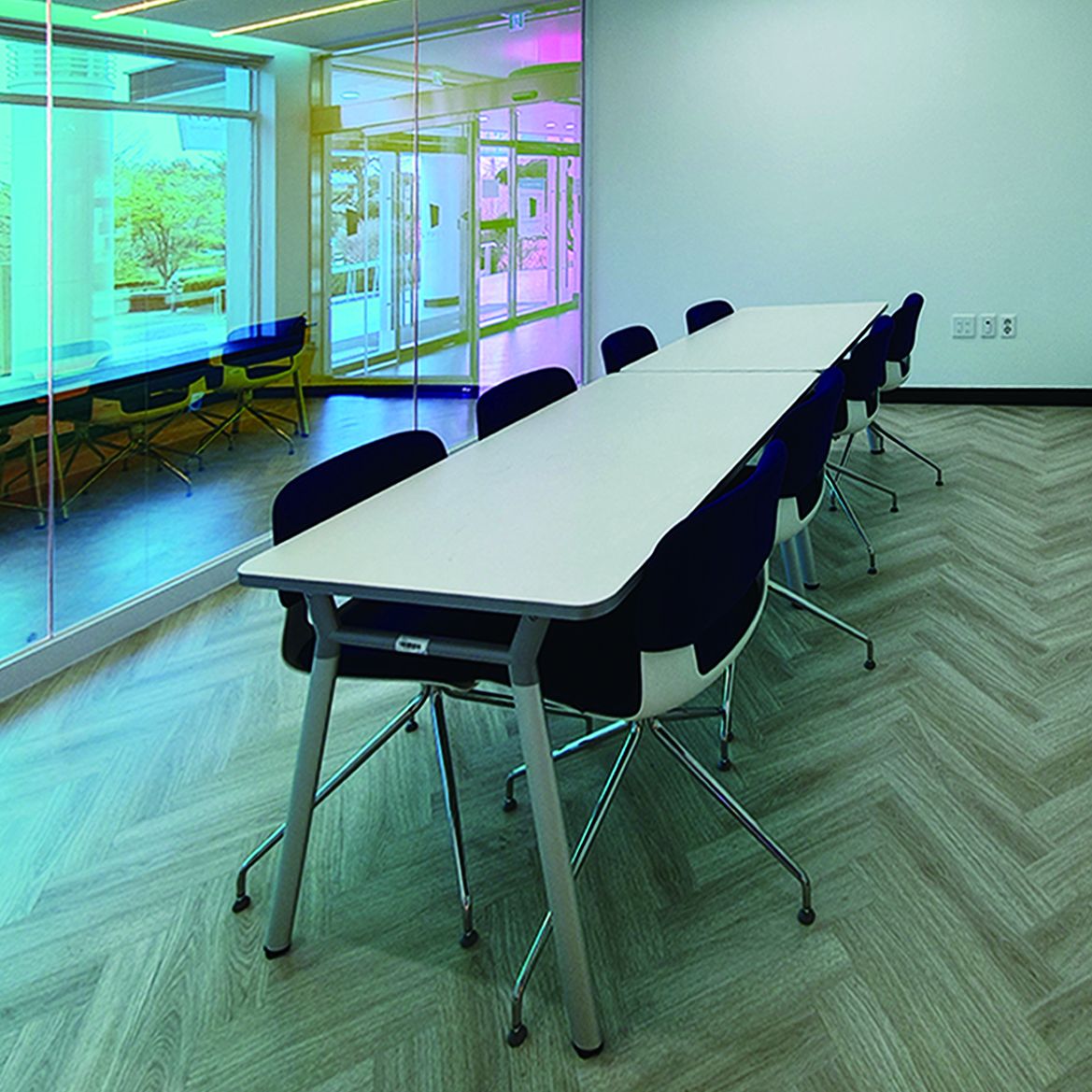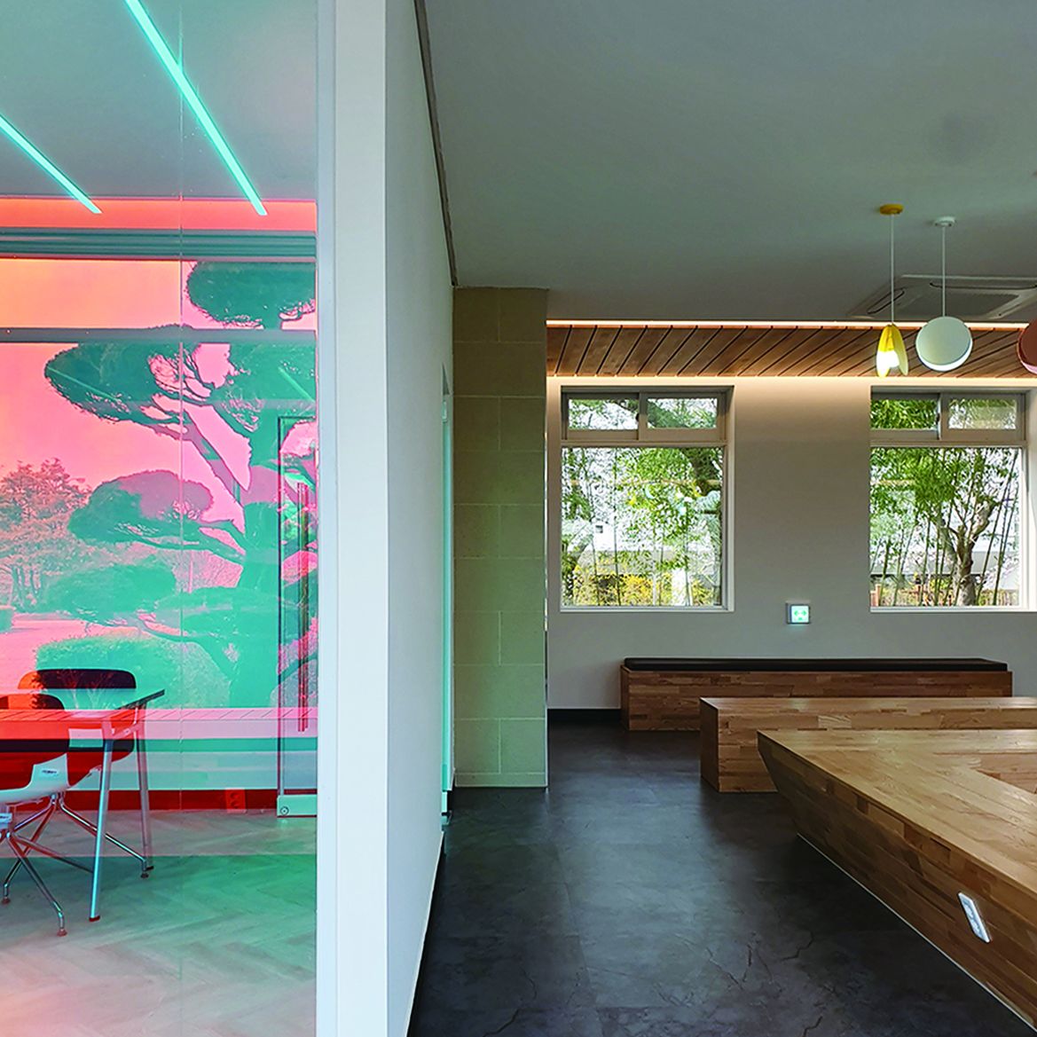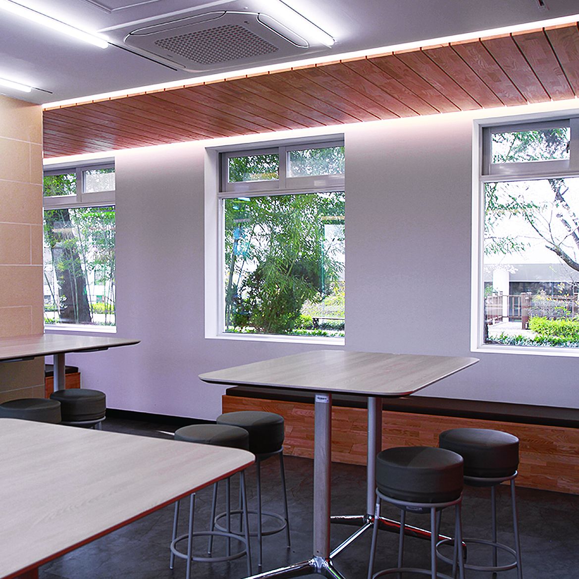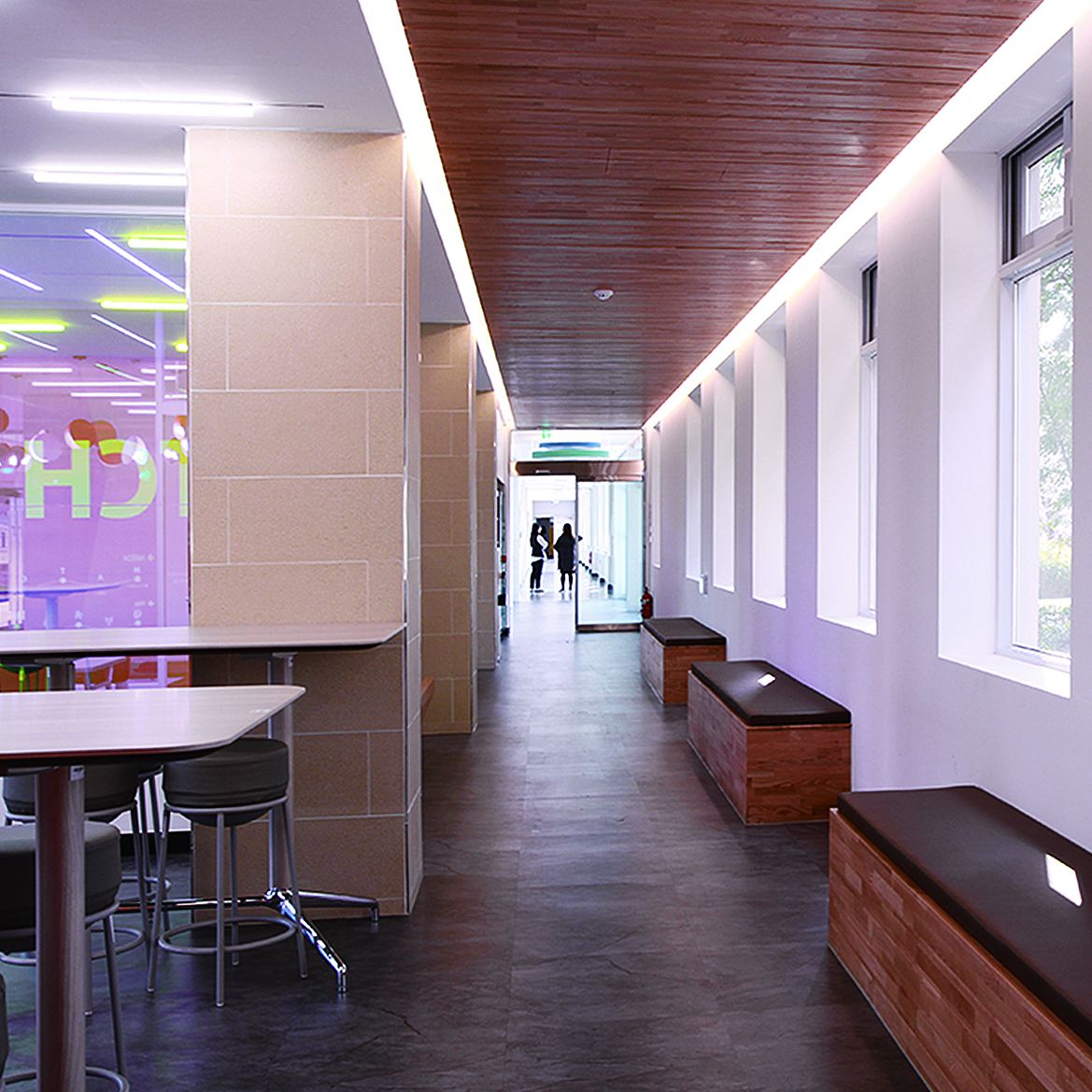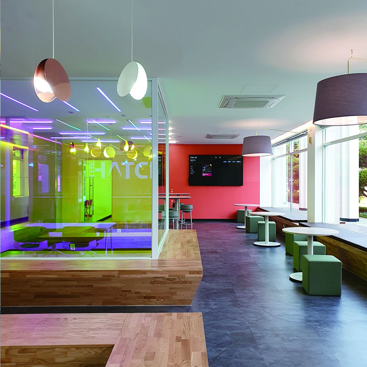 Student lounge design inside the College of Business at Jeonju University. The flexible space supports both team projects and individual study for business students, allowing natural transitions between collaboration and focus.