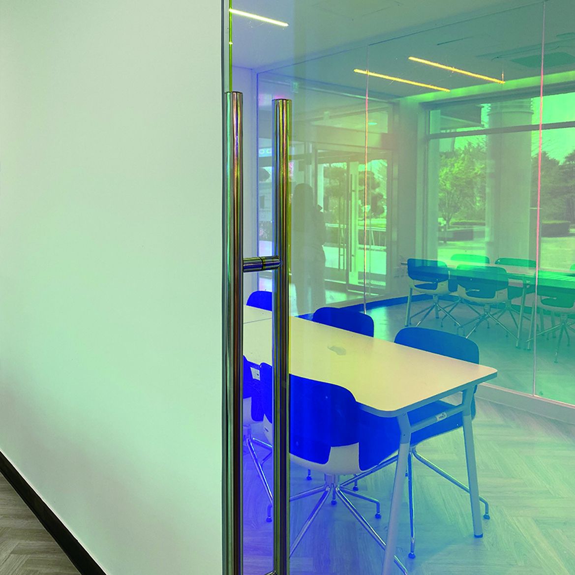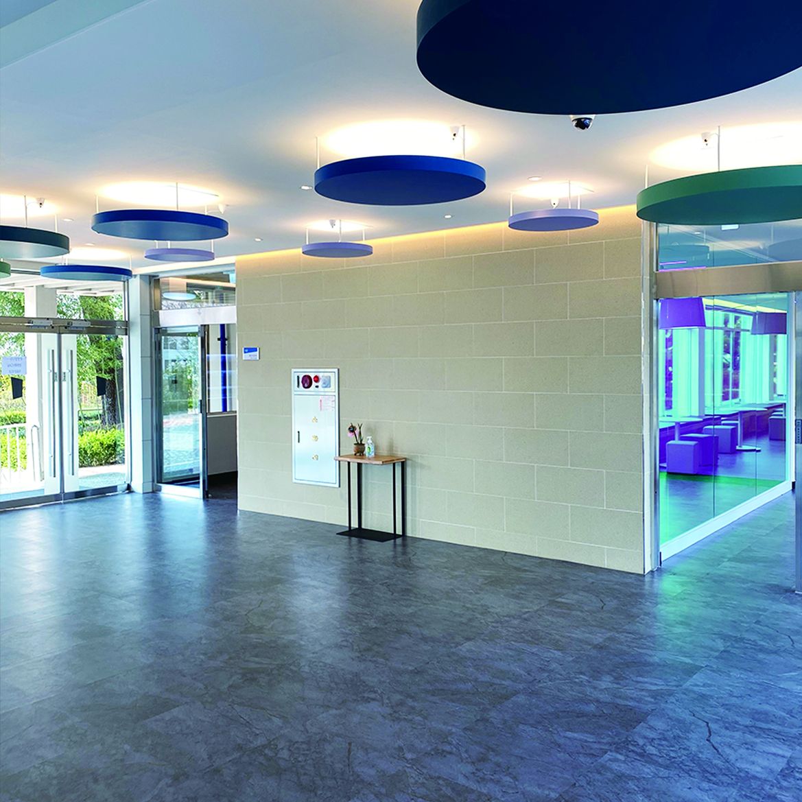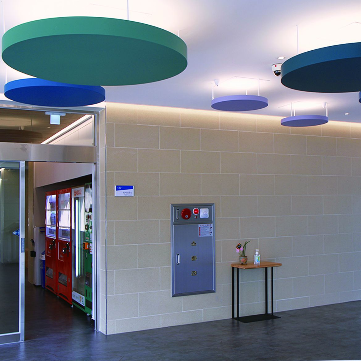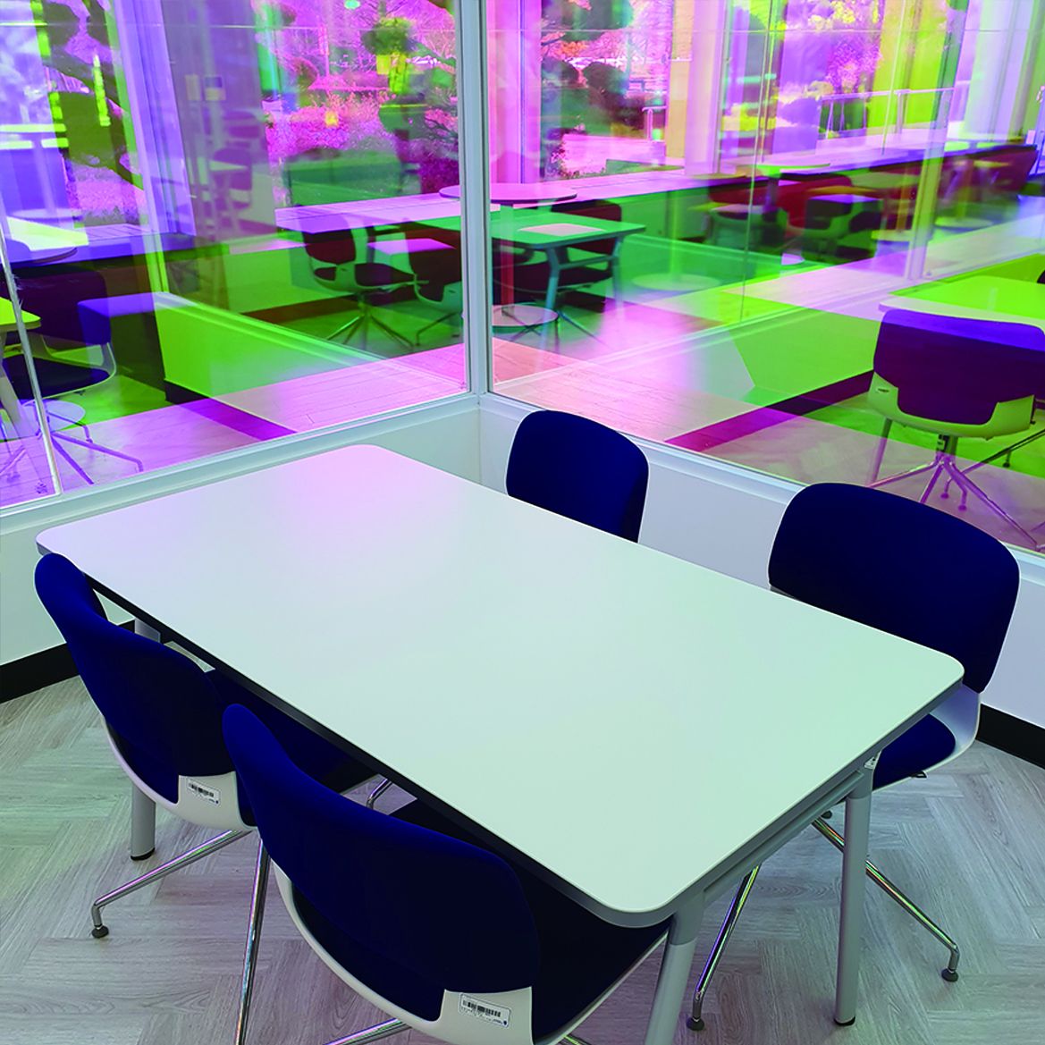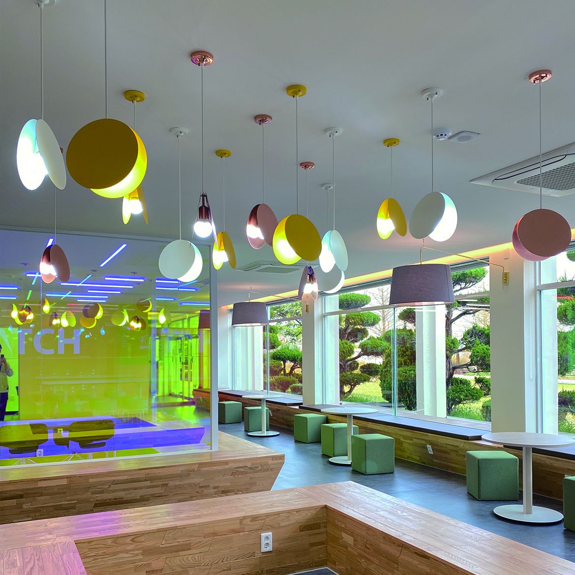 Student lounge design inside the College of Business at Jeonju University. The flexible space supports both team projects and individual study for business students, allowing natural transitions between collaboration and focus.