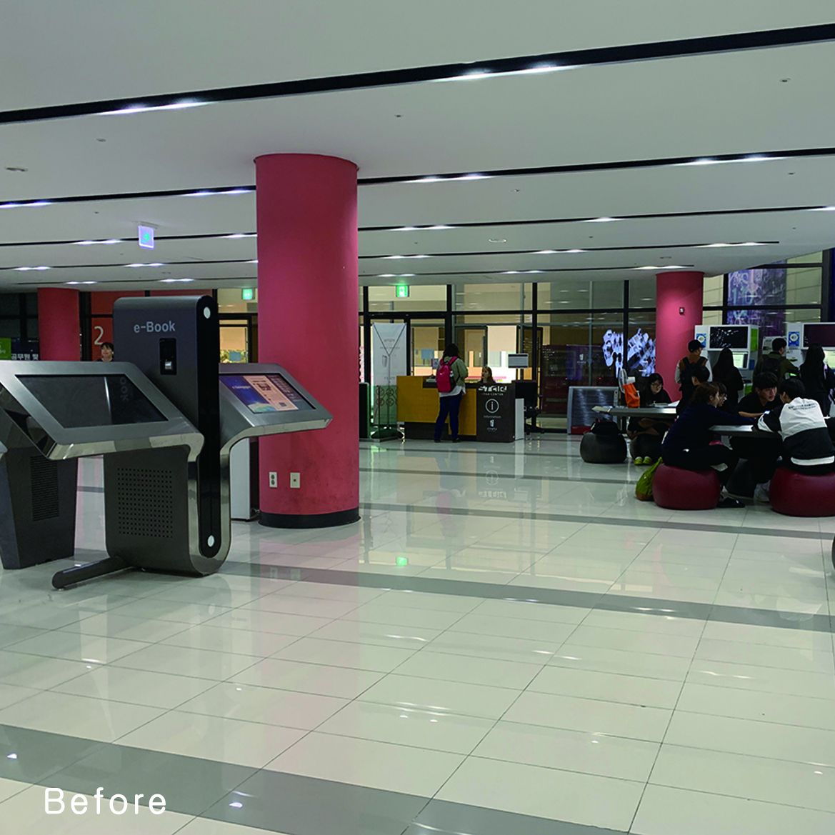 Student lounge design inside Jeonju University’s StarCenter. A flexible common space where students can gather freely, share ideas, and recharge, it uses a multi-purpose layout that accommodates diverse activities.